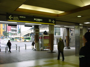 渋谷駅東口方面出口。右の方に歩道橋があります。