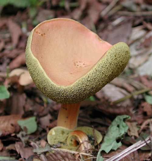 道ばたにいくつも出ていました。反り返るような姿形と,さわると青く変色する管孔がこの菌の特徴です。食用にできます。 Xerocomus subtomentosus (L.:Fr.) Quel Sep 2, 2001, Naganuma, Hachioji