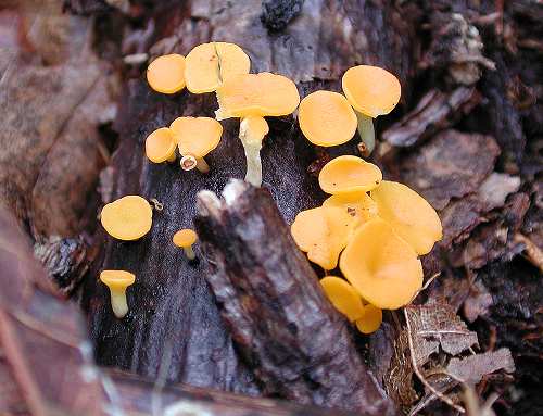 『ビョウタケ』(川口町、2000年10月) 雨降りの中を歩いていたらビョウタケがたくさん発生していました。子実体が画鋲に似ているからビョウタケと名前がついたのでしょう。 Bisporella citrina Korf et al. Oct. 1, 2000, Kawaguchi, Hachioji