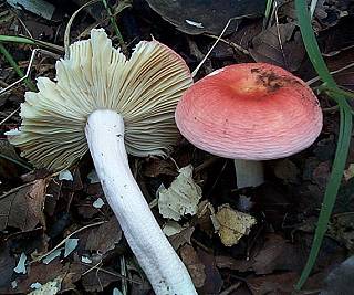 白い柄に紅色のカサがとても鮮やかなきのこです。この仲間には多くのそっくりな種が存在するので分類同定には慎重を要します。 Russula emetica (Schaeff.: Fr.) S.F. Gray Sep 5, 1999, Ohya-machi, Hachioji 『ドクベニタケ・胞子』