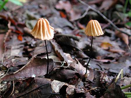 道路わきの枯れ葉の間から多数発生していました。可憐な姿が秋を感じさせます。小さなきのこですが一度にたくさん生えるので賑やかな雰囲気になります。 Marasmius pulcherripes Peck Oct 15, 2000, Shimoongata, Hachioji