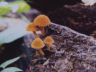 『ヒメスギタケ』(元八王子町、1999年6月) シイタケのホダ木に発生したところをみつけました。 Phaeomarasimius erinaceella (Peck) Sing. June, 1999, Motohachioji, Hachioji