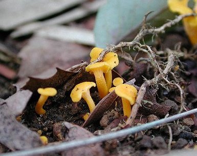 湿り気のある地面が時々あざやかなオレンジ色に見えることがあります。よく見ると1センチ足らずのヒナアンズタケが群生していました。小さいので画像に収めるのがなかなか難しい種類です。 Cantharellus minor Peck Aug 19, 2000, Naganuma, Hachioji