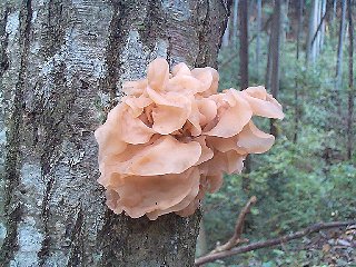 『ハナビラニカワタケ』(川口町、1999年11月) 立ち木の枯れ木に生える菌です。主に秋から冬にかけて見られます。食用菌で、キクラゲのように利用できます。 Tremella foliacea Pers.: Fr. Nov 3, 1999, Kawaguchi, Hachioji