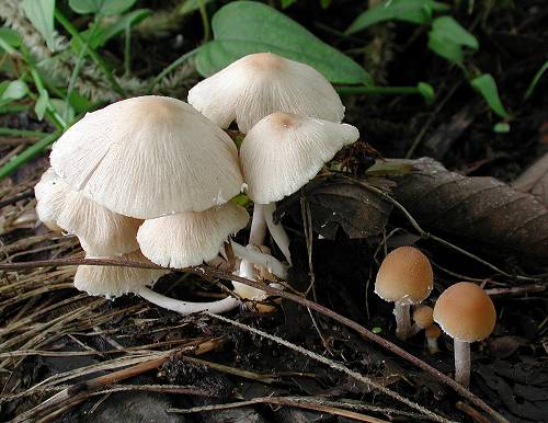 栗林の茂みの材上に発生していたイタチタケです。幼菌と成菌とではカサの色に違いがあります。頼りなげですが繊細な美しさがあります。 Psathyrella candolliana (Fr.:Fr.) Maire June 16, 2001, Kawaguchi, Hachioji