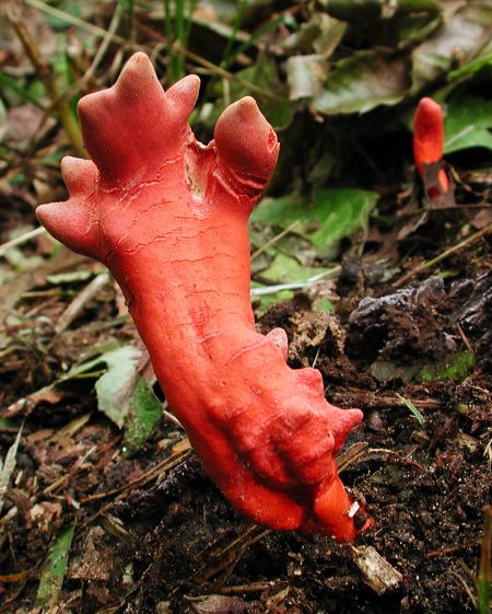 真っ赤で不気味な形をしたきのこです。腐った木の近くから発生するように思います。致死性の強力な毒性を持ち,中毒すると嘔吐や下痢だけでなく脳障害のような症状まで呈し死に至るという恐ろしいきのこです。 Podostroma cornu-damae (Pat.) Boedijin Sep 22, 2002, Naganuma, Hachioji
