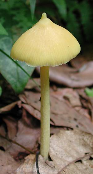 カサの先端にイボ状の突起があるきのこです。黄色のすらりとした姿が美しいですが、有毒とされています。 Rhodophyllus murraii (Berk. et Curt.) Sing. July 5, 2003, Kawaguchi, Hachioji