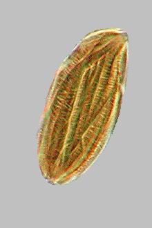 胞子です。表面に微細な模様がありますが,光学顕微鏡の解像限界付近の大きさのため,油浸レンズを使用して注意深く観察しないと存在すらわかりません。この画像は,胞子をつぶして平らにして,さらに斜光照明にして撮影したものです。