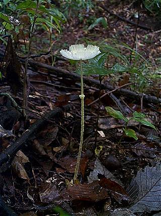 小さいながらも美しいきのこです。細く長い柄と、透明感のある色合いが印象的です。 Leucocoprinus fragilissimus (Rav.) Pat. Sep 18, 1999, Kawaguchi, Hachioji