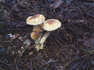 『コバヤシアセタケ(?)』(川口町、1999年9月) 雑木林のいたるところで見られます。ぽこっぼこっ、という雰囲気で出てきます。姿からの判断では間違いなくコバヤシアセタケなのですが、「似ている」だけでは同定とはいいがたいので「?」を付けてあります。命名は本郷次雄博士で、菌学者小林義雄への献名だと思われます。 Inocybe kobayasii Hongo Sep 23, 1999, Kawaguchi, Hachioji