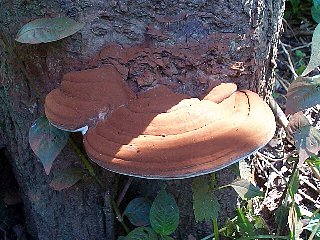 ウメの木の根元に生えた中型の菌です。形態はサルノコシカケ型ですが、マンネンタケの仲間です。周辺が胞子で茶色になっています。 Ganoderma applanatum (Pers.) Pat. Sep 11, 1999, Kawaguchi, Hachioji