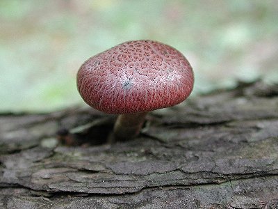 ミドリスギタケの幼菌で、スギから発生しているところです。まるでシイタケのようにポコポコと生えてきます。カサカサ模様があり、緑色のしみが表面にあるのが特徴です。肉質もしっかりしており見た目にもおいしそうなのですが、苦みがあり食用にはできません。 Gymnopilus aeruginosus (Peck) Sing. Aug 12, 2000, Uratakao, Hachioji