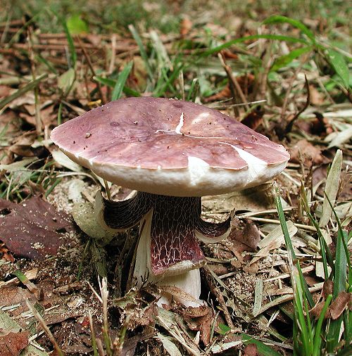 全体が紫色で柄が網目に覆われた美しい姿形のきのこです。味も一級品です。雑木林地上に,夏早くと秋の2回発生することが多いです。画像のきのこは乾燥気味のときに成長したので柄の表面が裂けています。 Boletus violaceofuscus Chiu Sep 22, 2002, Naganuma, Hachioji