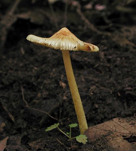 『オオキヌハダトマヤタケ』(長沼町,2002年7月) よくみかけるきのこです。繊維ぽい質感と,とがったカサが特徴的です。分類は難しいのですが,柄の基部や胞子の形から本種と判断しました。 Inocybe cookei Bres. Jul 21, 2002, Naganuma, Hachioji 胞子です。これといった特徴のない形です。