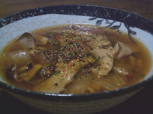 まず、鍋に湯をわかし、きのこをどっさり入れる。クセのないきのこなら何でもよいように思うが、野生のきのこなら、ヒラタケ・エノキタケ(真冬に出るしっかりしたやつが特によい)がおすすめだ。ホテイシメジやチャナメツムタケでもおいしいし、試したことはないが、ナラタケでもきっとおいしいだろう。次に豚小間を入れ、さらに白菜をどっさり入れる。煮立ったら酒を(好みの量だが)どぼどぼ入れ、しょう油で適当な濃さに味付けする。濃いだしが好みの人は、あらかじめこんぶでだしをとってから作るとよいと思う。あとは30分ほどことことと煮込んで、あくをすくえばできあがり。必ず七味とうがらし(できれば作りたてのもの)をかけていただく。