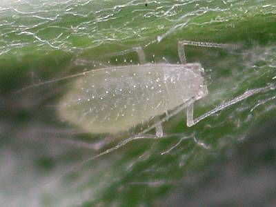 これはケンコー(株)から発売されているアダプターに顕微鏡用の10倍接眼レンズを接続し,接眼レンズのスリーブ(顕微鏡に差し込む部分)を外したものである。工作は不要でじつに簡単である。それでいて,マクロ用のクローズアップレンズとして充分な性能を持っている。ニコンのE990に装着した場合,マクロモードで最も接近した場合の約2.5倍の拡大率が得られる。なんだ,たった2.5倍か,と思わないで欲しい。この拡大率はちょうどマクロ撮影と低倍率の顕微鏡撮影の橋渡し付近なのである。下にアブラムシの幼体の画像を示す。上が990で接写,下が接眼レンズ使用による画像である。そのままでは写らない微細な構造が,接写レンズ使用では明瞭に写っているのがわかるであろう。