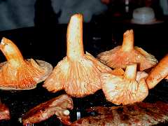 焼き物: アカモミタケはさっと洗ってざるにあげてお く。金網または鉄板を熱し、アカモミタケを焼く。縮んで 火が通ったら焼き肉のタレをつけていただく。あつあつを ほおばると充実のおいしさ。他には天ぷら、きのこご飯も たいへんおいしい。 焼けるのが待ち遠しい 立派なおいしさ。 ・・・ 料理リストに戻る トップに戻る
