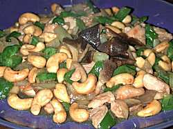 タマネギ、ピーマン、カシューナッツ、ハタケシメジを同時に炒め、