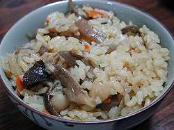 出来上がり。きのこの持ち味を生かした食べ方です。きのこご飯: ハタケシメジは手で割いて適当な大きさにしておく。