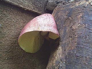 大型の菌でわりとよくみかけます。腐った木に生えることが多く、杭などにも発生します。残念ながら食用価値は高くないようです。 Tricholomopsis rutilans (Schaeff.: Fr.) Sing. Oct 17, 1999, Motohachioji, Hachioji