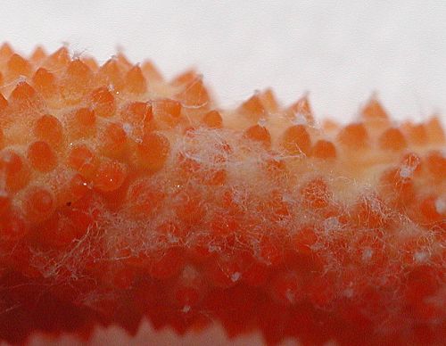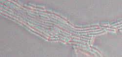 竹藪からにょっきりと生えていました。割と鮮やかな色で目立ちます。このきのこを掘り下げると土中で昆虫のサナギにつながっています。 Cordyceps militaris (Vull.) Fr. Nov, 2003, Naganuma, Hachioji 二次胞子を放出したところです。 二次胞子の顕微鏡写真です。小さく,幅は0.001mm(=1μm)くらいです。