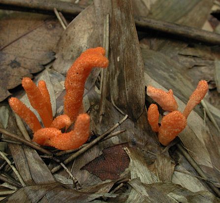 『サナギタケ』(長沼町,2003年11月) 竹藪からにょっきりと生えていました。割と鮮やかな色で目立ちます。このきのこを掘り下げると土中で昆虫のサナギにつながっています。 Cordyceps militaris (Vull.) Fr. Nov, 2003, Naganuma, Hachioji 二次胞子を放出したところです。 二次胞子の顕微鏡写真です。小さく,幅は0.001mm(=1μm)くらいです。 種別索引に戻る あいうえお順索引に戻る