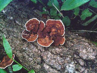 『タコウキンの一種』(川口町、1999年9月) カワラタケやスルメタケに似ていますが未同定です。林内の草地に横たわる朽ち木から生えていました。 Polyporaceae Sep 4, 1999, Kawaguchi, Hachioji