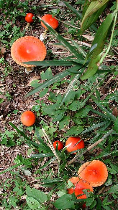 雑木林にふつうに見られる美しいきのこで、遠くからでも目立ちます。派手な色合いですが無毒で、食用にされます。