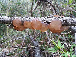 立ち木の枯れ枝によく発生する,春を告げるキクラゲです。乾燥時は薄く貼りついていて目立ちませんが,雨上がりに見つけると画像のようにプックリと膨らんできれいです。 Exidia uvapassa Apr 22, 2000, Motohachioji, Hachioji