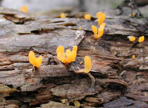 『ツノマタタケ』(川口町、2001年6月) オレンジ色の美しいきのこです。大きさは5ミリほど。畑の脇に放置された材から生えていました。 Guepinia spathularia (Schw.) Fr. June 16, 2001, Kawaguchi, Hachioji