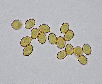 秋に倒木から一斉に発生するきのこです。地味で目立たず,誰も相手にしないきのこです。ヒダは黄色で密なところが見分けるポイントです。 Gymnopilus liquiritiae (Pers.:Fr.) Karst. Sep 15, 2002, Motohachioji, Hachioji 胞子です。一見したところ特徴のない形です。 しかし表面を注意深く観察すると微細な突起に覆われていることがわかります。