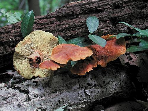 『チャツムタケ』(元八王子町,2002年9月) 秋に倒木から一斉に発生するきのこです。地味で目立たず,誰も相手にしないきのこです。ヒダは黄色で密なところが見分けるポイントです。 Gymnopilus liquiritiae (Pers.:Fr.) Karst. Sep 15, 2002, Motohachioji, Hachioji 胞子です。一見したところ特徴のない形です。 しかし表面を注意深く観察すると微細な突起に覆われていることがわかります。