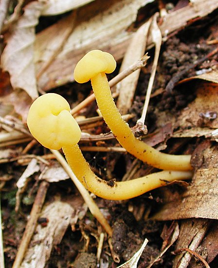 『ズキンタケ』(長沼町,2002年10月) 湿り気のある斜面から発生していました。大きさはわずか一センチ程度の小さなきのこで,うっかりすると見過ごしてしまいます。しかしよくみると愛らしい形態をしています。多くの類似種があるとされており,この画像もズキンタケ属の一種と考えた方が無難なようです。 Leotia lubrica (Scop.: Fr.) Pers.: Fr. f. lubrica Oct 12, 2002, Naganuma, Hachioji 種別索引に戻る あいうえお順索引に戻る