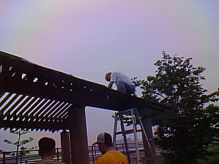到着したときは、まだ小雨が降っていたため、ブルーシートを屋根に張るしんさん。