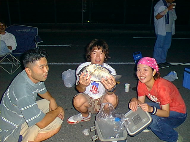 今回の釣果はふくちゃんがチヌ3匹、ふくちゃん奥様がボラ一匹(いや、一頭。かなり大きかったらしい。)、青箱奥様がスズキを一匹(いや、一枚??手のひらサイズでかわいかったです。)をそれぞれゲット!!後の人たちは???ふ〜〜〜。なにも聞かないで!!