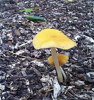 近所のきのこのよく出る公園で見つけました。この公園には木材チップが敷いてあるので、いろいろの菌が出ます。ベニヒダタケは黄色のカサが美しい菌です。 Pluteus leoninus (Schaeff.: Fr.) Kummer Sep 18, 1999, Kawaguchi, Hachioji