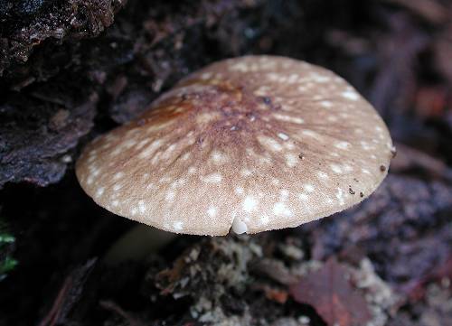 シイタケのほだ木から発生していました。遠目にはウラベニガサに似ていますが,カサの表面に見事な斑点模様があり,柄がつやつやしているのが特徴です。珍しい種とされています。 Pluteus pantherinus Courtecuisse et Uchida June 16, 2001, Kawaguchi, Hachioji 上のきのこの胞子です。大きさは約6μmです。