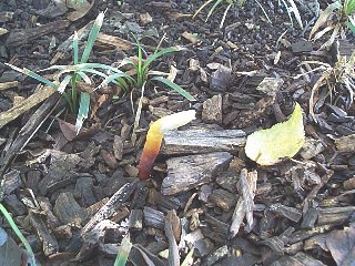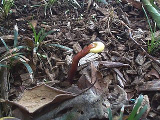 ウメの木の根元から発生が始まりました。初めは柄が伸びて、やがて先端の白い部分がカサに生長します。