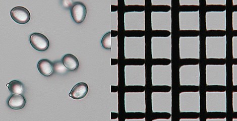 上の画像はイメージをつかみやすくするために縮小してある。実際はもっと大きな画像サイズで比較した方が胞子の大きさを見積りやすい。方眼マイクロメーターの格子間隔は10μmである。胞子と定規を同時に撮影しているようなものだから,この画像からも胞子の大きさを求めることができる。同じシステムで撮影し,アイピース・ズーム位置,対物レンズに変更がないのであれば,毎回ミクロメータを撮影する必要はない。歪曲収差,像面湾曲の影響で見積り値が不正確になるのをさけるために,比較は画像中心でピントのよく合った部分で行なう。 ![]()