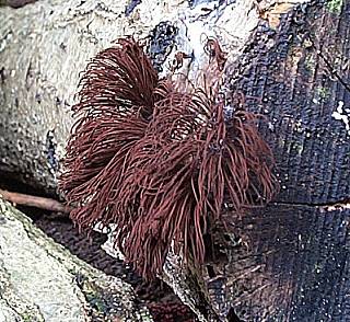 胞子嚢の長さから見てムラサキホコリだと思われます。変形菌の仲間は、どこかを歩いていたアメーバー体が突然この画像のような子実体を形成して胞子を飛散させます。 Stemonitis fusca Sep 15, 1999, Motohachioji, Hachioji