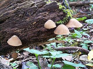 『ムササビタケ』(元八王子町、1999年9月) 古い枯れ木から発生していました。老菌はカサの縁がとけていました。 Psathyrella piluliformis (Bull.: Fr.) P. D. Orton Sep 15, 1999, Motohachioji, Hachioji