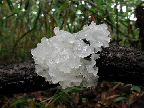 『シロキクラゲ』(川口町、2001年6月) シイタケのほだ木に生えていました。5月ころから広葉樹林でふつうに見られます。乾くとほとんどわからなくなってしまうので、雨の中か、雨上がりに探しに行くと見つけやすいでしょう。食用で、乾燥品が市場に出回っています。 Tremella fuciformis Berk. June 17, 2001, Kawaguchi, Hachioji