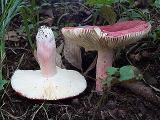 『ヤブレベニタケ』(川口町、1999年9月) カサが鮮やかな紅色のきのこです。柄がわずかに赤みがかかっています。これがドクベニタケとの判別点といわれています。 Russula rosacea (Pers.) S.F. Gray Sep 11, 1999, Kawaguchi, Hachioji