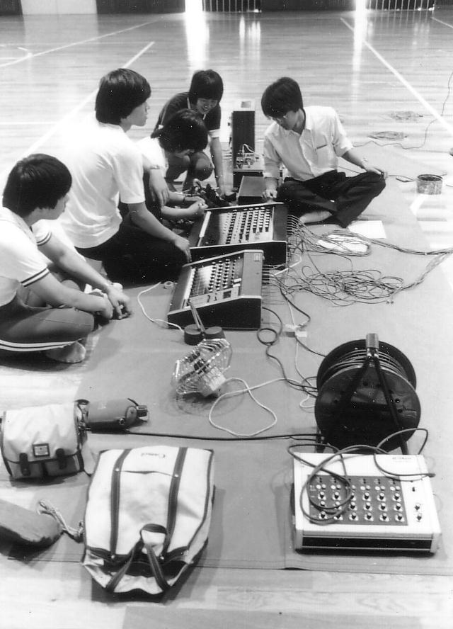 1980年 校門 体育館でのPA準備 (坂口さん提供)